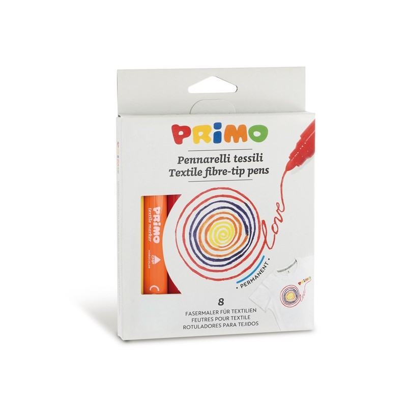 Pennarelli per tessuto, in scatola di cartone, 8 colori. Facile da applicare, luminoso nel risultato permette di creare disegni e linee più sottili. Una volta asciutto è permanente sui tessuti. Stirare dal rovescio.Una volta asciutto non è lavabile dai tessuti.