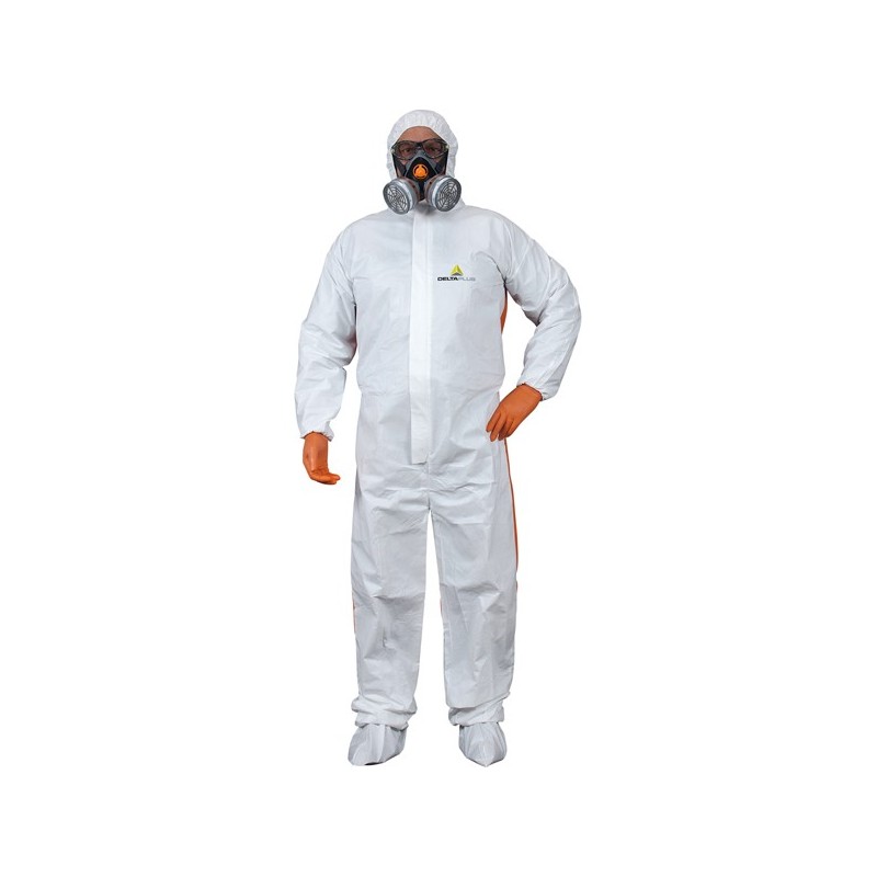 Tuta con cappuccio elasticizzata non tessuto (70% polipropilene 30% polietilene). Parte posteriore 100% polipropilene SMS molto traspirante. Chiusura zip sotto baverina. Elastico di chiusura in testa, in vita, ai polsi ed alle caviglie. 70% polipropilene 30% polietilene - non tessuto bianco. Il polietilene assicura una migliore resistenza alle aggressioni chimiche oltre che una migliore resistenza meccanica (abrasione - lacerazione). 100% polipropilene SMS - non tessuto arancione. Il processo SMS fornisce una migliore traspirazione del prodotto. Rinforzo tra le gambe per una maggiore resistenza agli strappi. Categoria DPI: 3. Certificazione CE. Conformità alle norme EN ISO 13688:2013, EN ISO 13982-1:2004+A1:2010, EN13034:2005+A1:2009, EN1073-2:2002 e EN1149-5:2018.