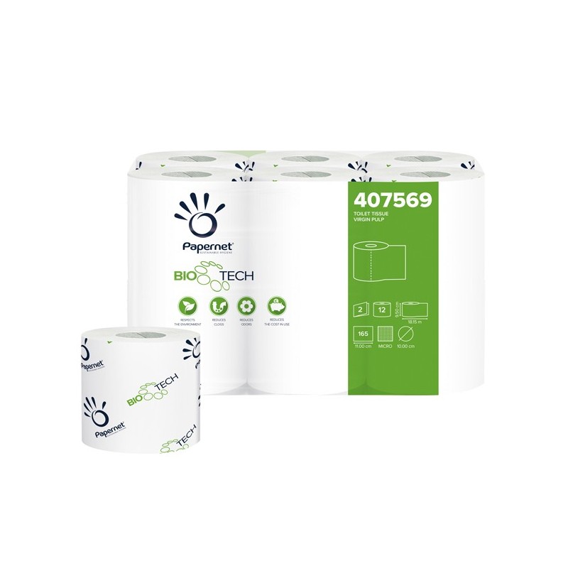 IN PURA CELLULOSA 2 VELI MICROGOFFRATA. ROTOLO CLASSICO Ø10CM H9,5CM X 18,15MT. 165 STRAPPI DA 11X9,5CM. PRODOTTA CON L'ESCLUSIVA TECNOLOGIA BATP (BIOLOGIC ACTIVE TISSUE PAPER). Rotoli fascettati singolarmente particolarmente adatti per il settore HO.RE.CA.
