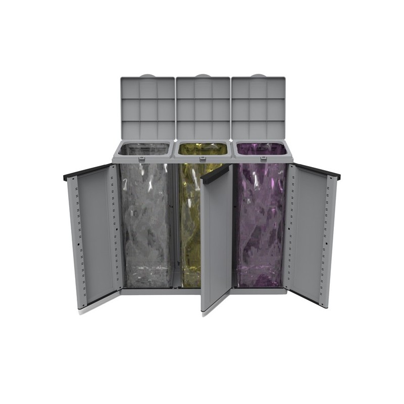 Armadietto a tre ante ideato per la raccolta differenziata dei rifiuti. Dotato di due porta-sacco da 110 lt ciascuno chiudibili con coperchio. L'apertura delle ante permette una facile estrazione frontale dei sacchi pieni. Adatto per utilizzo in ambiente esterno . Da montare. Dimensioni: 102x39x88,7cm - 110+110+110lt.