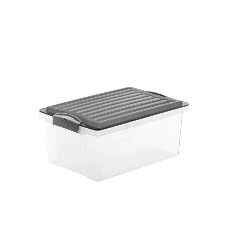 Scatole in robusto ppl con coperchio bloccabile. Il coperchio può essere capovolto quando è necessario avere più spazio all'interno della scatola o per un migliore impilamento. Dimensione: 39,5x27,5xH27cm (A4). Capacità 19 litri.