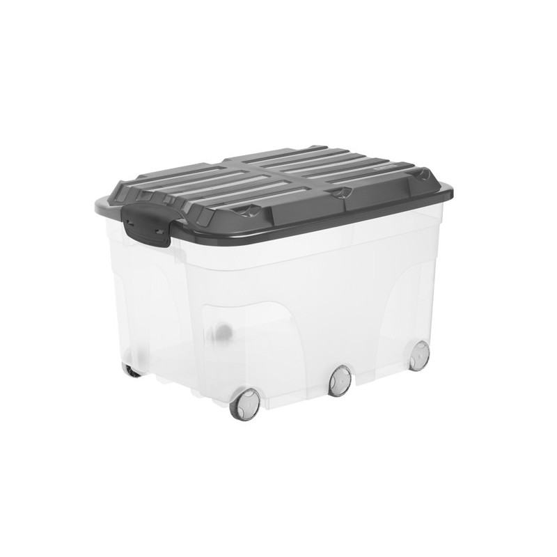 Scatole in robusto ppl con coperchio bloccabile. Grazie agli incavi sul coperchio, possono essere perfettamente sovrapposte fra loro nonostante le ruote. Contenitore dotato di 6 ruote. Dimensione: 59,5x40xH37cm. Capacità 57 litri.