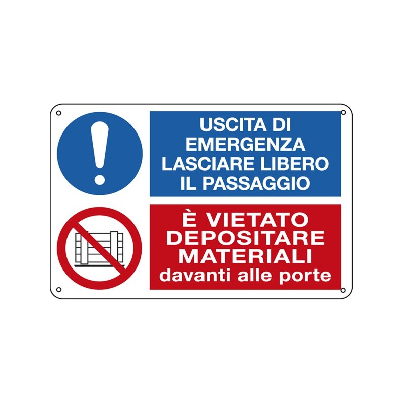Cartello segnalatore multisimbolo - 30x20 cm - USCITA DI EMERGENZA…/E' VIETATO DEPOSITARE… - alluminio - Cartelli Segnalato