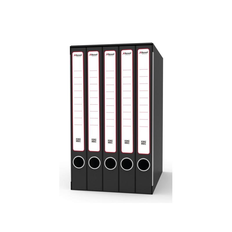 Sistema di archiviazione King Mec composto da un'unica custodia con 5 cartelline a tre alette (dorso 4 cm; formato utile LxH 23x32 cm). Struttura in robusto cartone grigio rivestito con carta goffrata nera antimpronta. Custodia in tinta con parabordi. Anello di estrazione in acciaio. Etichetta adesiva già posizionata sul dorso. Ideale per fogli che non sono da perforare. Dimensioni esterne 23,5x25x35 cm.