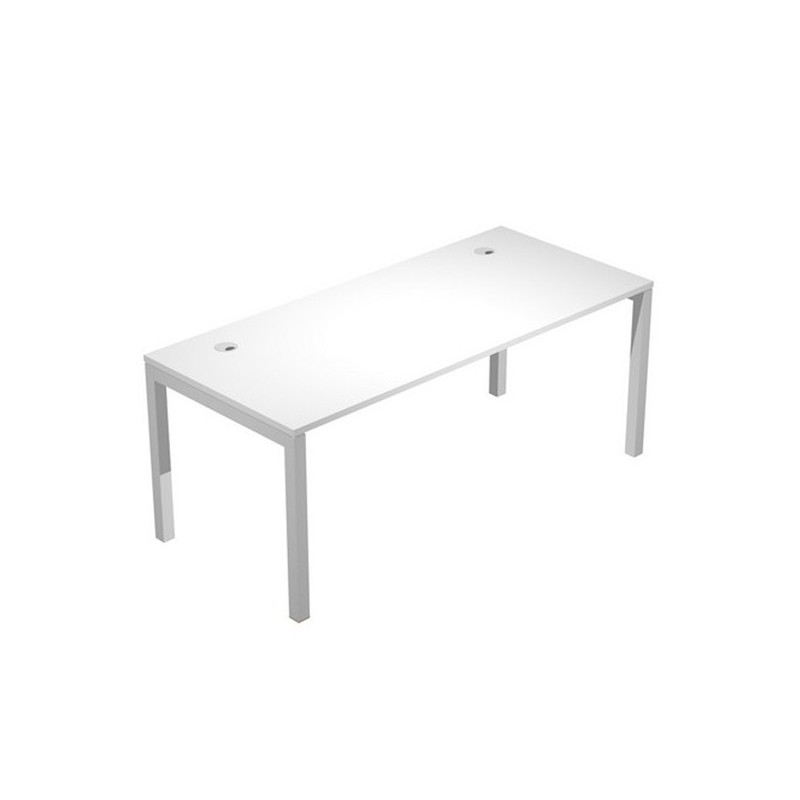 Scrivania per postazione singola dimensioni: L180 x P80 x H72,5cm. Le scrivanie per postazione singola o multipla, sono in bilaminato nobilitato melaminico conforme alle norme UNI e EN classe E1, antigraffio ed antiriflesso, hanno sp. 25 mm con bordo sp. 2 mm in ABS resistente agli urti. Sono caratterizzate da robuste gambe a ponte in metallo a sezione quadrata (50 x 50 mm) verniciate a polveri epossidiche nel colore grigio alluminio, complete di piedini regolabili in altezza.