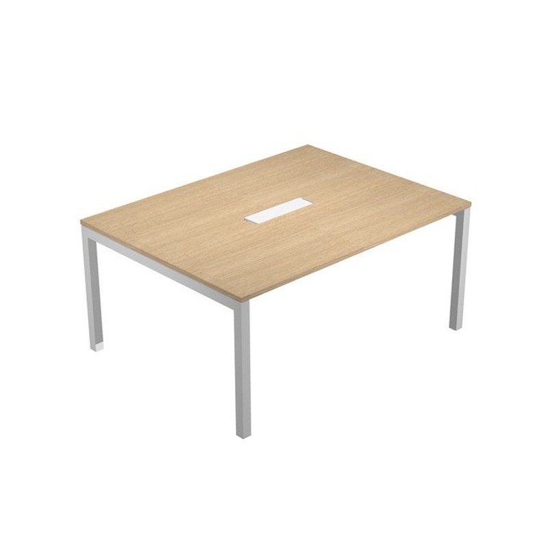 Tavolo riunioni con piano 160 x 120 cm, in spessore 25 mm, con assenza di spigoli vivi, bordato in abs sp.2 mm. Realizzato in materiale melaminico, classe E1, con finitura antigraffio e antiriflesso. Struttura in metallo, con solida gamba di sezione 50x50 mm. in finitura grigio alluminio. Piano dotato di ampio passacavi rettangolare centrale.