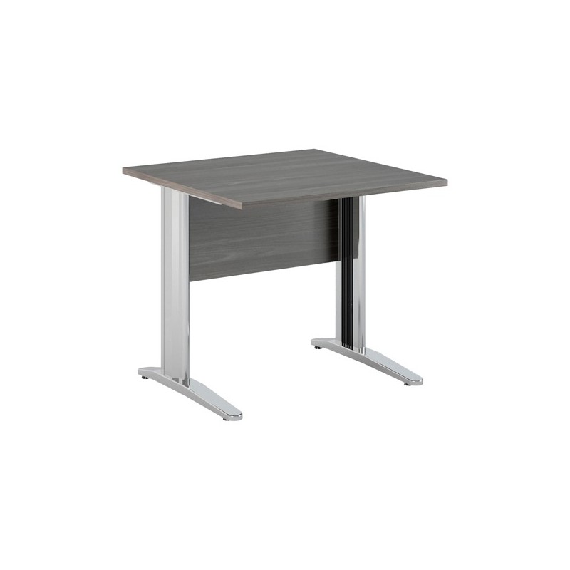 Scrivanie con dimensioni conformi alle normative sulla sicurezza dei posti di lavoro in ufficio. Bordatura dei piani in ABS 2mm antishock ed assenza di spigoli vivi. Le scrivanie sono disponibili nella versione con fianchi pannello in melaminico (sp. 22 mm) o con fianchi in metallo ad L verniciati effetto cromo completi di piedini regolabili in altezza e canalina passacavi ispezionabile. Dimensioni: L80 x P80 x H72cm
