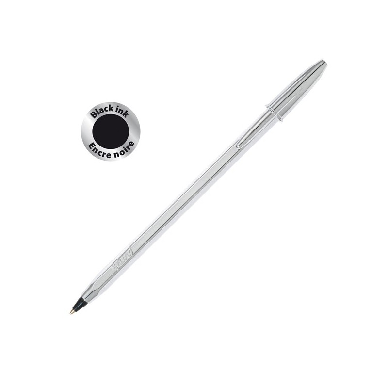 La classica Bic Cristal media con punta da 1mm in versione Shine Silver con fusto color argento, inchiostro nero.