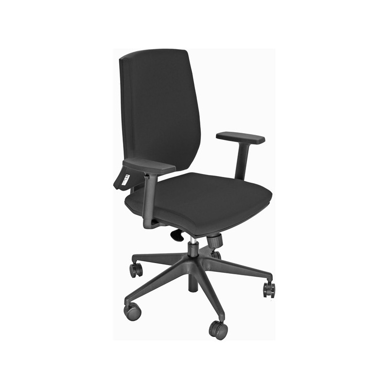 Poltrona semidirezionale H12 (adatta per uso intenso). Schienale alto in spugna con supporto lombare regolabile. Rivestimento seduta in tessuto NO FLAME (reazione al fuoco classe 1). Braccioli regolabili e base in nylon. Meccanismo syncro con 4 blocchi anti shock, meccanismo a contatto permanente. Schienale regolabile up-down. Elevazione a gas.