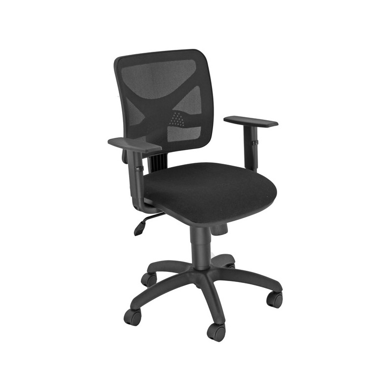 Seduta operativa con schienale medio in rete nera. Meccanismo a contatto permanente. Elevazione a gas. Base in nylon con ruote. Rivestimento in tessuto acrilico 100%. Braccioli regolabili inclusi.