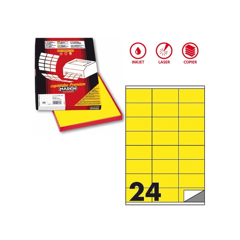 Scatola da 100 fogli di etichette in carta adesiva permanente nei colori fluo in formato 21x29,7cm adatti per fotocopiatrici, stampanti laser, inkjet.