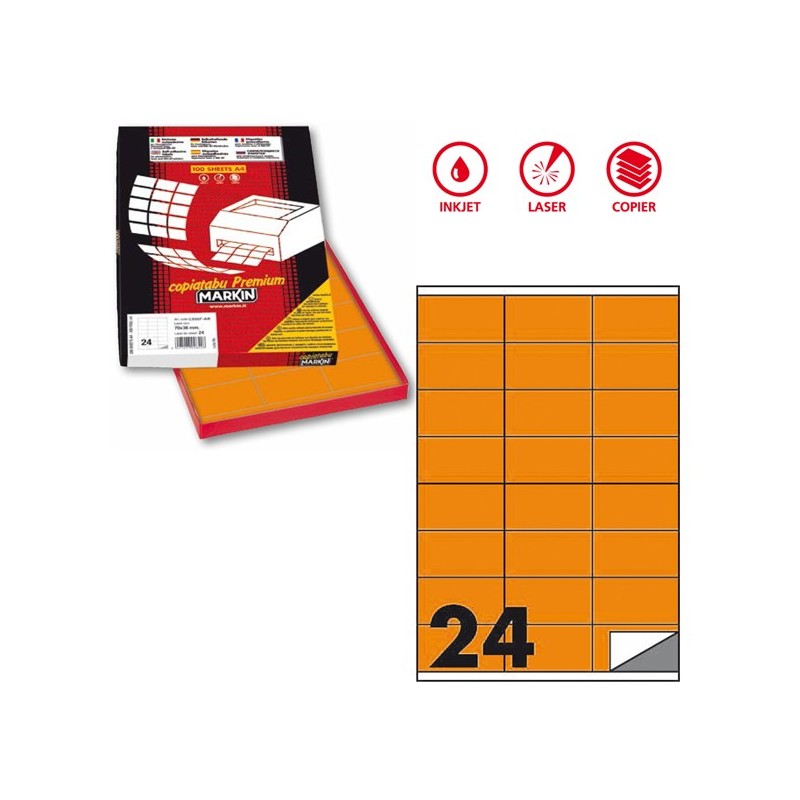 Scatola da 100 fogli di etichette in carta adesiva permanente nei colori fluo in formato 21x29,7cm adatti per fotocopiatrici, stampanti laser, inkjet.