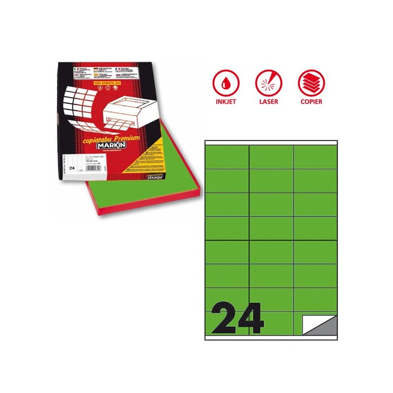 Scatola da 100 fogli di etichette in carta adesiva permanente nei colori fluo in formato 21x29,7cm adatti per fotocopiatrici, stampanti laser, inkjet.