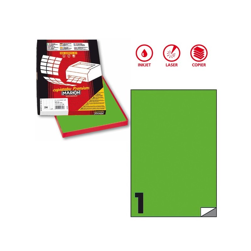 Scatola da 100 fogli di etichette in carta adesiva permanente nei colori fluo in formato 21x29,7cm adatti per fotocopiatrici, stampanti laser, inkjet.
