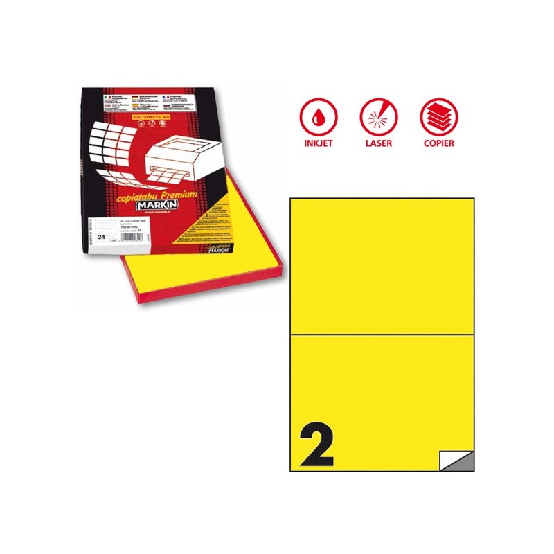 Scatola da 100 fogli di etichette in carta adesiva permanente nei colori fluo in formato 21x29,7cm adatti per fotocopiatrici, stampanti laser, inkjet.