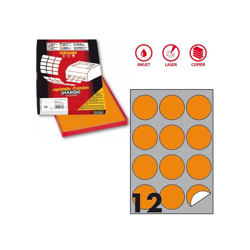 Scatola da 100fogli da 21x29,7cm (A4) di etichette in carta fluo arancio adesive permanenti nel formato. Stampabili con stampanti inkjet, laser e fotocopiatori. 12 etichette tonde per foglio.