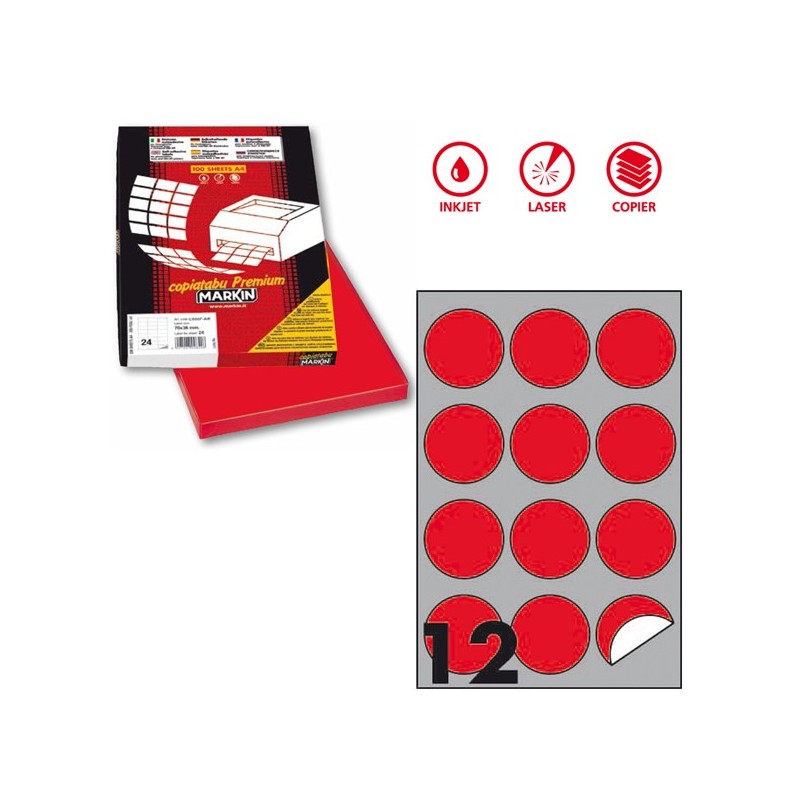 Scatola da 100fogli da 21x29,7cm (A4) di etichette in carta fluo rosso adesive permanenti nel formato. Stampabili con stampanti inkjet, laser e fotocopiatori. 12 etichette tonde per foglio.