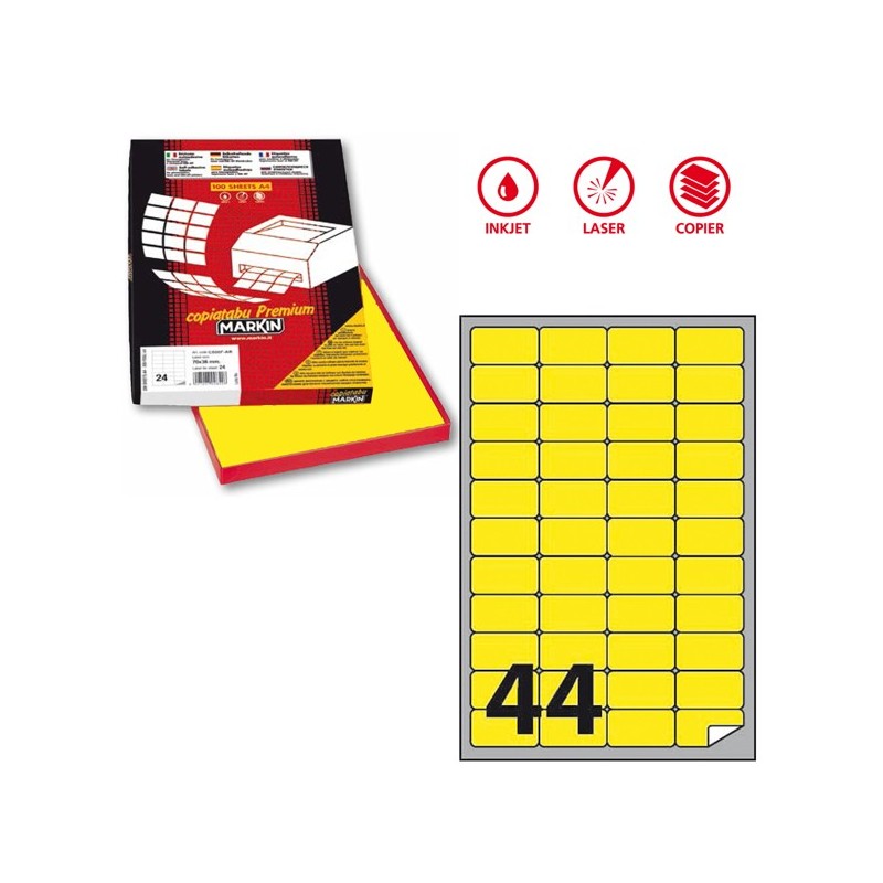 Scatola da 100fg da 21x29,7cm di etichette adesiva permanente giallo fluo. Etichette con angoli tondi. Adatte per stampanti inkjet, laser e copy.
