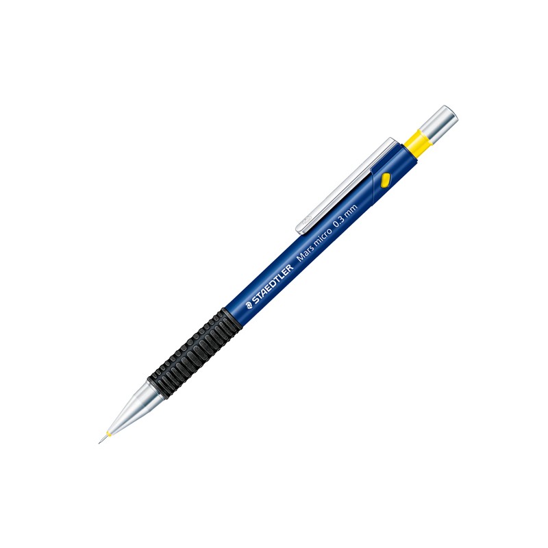 Portamine Mars Micro 775 ideale per scrittura e disegno tecnico, dotato di impugnatura in caucciù naturale, pulsante, gommino sostituibile, clip, puntale ad ago rientrante e mina molleggiata. Mina 0,3mm.