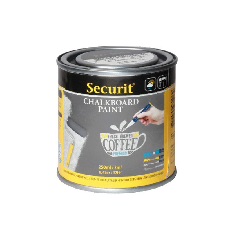 La pittura lavagna è una vernice nera da applicare su pareti o su oggetti per trasformarne la superficie in una lavagna. Può essere utilizzata su tutte le superfici che diventeranno in questo modo scrivibili con: gesso classico o gesso liquido (ideale per una cucina o un ristorante per scrivere un grande menu su una parete, basterà cancellarlo con un panno bagnato). La pittura può essere applicata anche all’esterno, se utilizzata con il gesso liquido resistente all’acqua, per avere superfici su cui comunicare resistenti alla pioggia. Per la rimozione delle scritte serve lo spray Securit (cod. 77386).