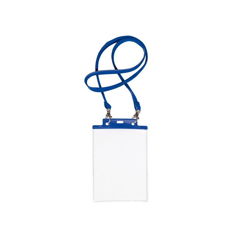 Porta nomi in PVC trasparente pesante con porta biglietti da visita, cordoncino blu con dettagli in tinta. doppio moschettone. Formato contenuto 15x21cm. Apertura lato corto (alto).