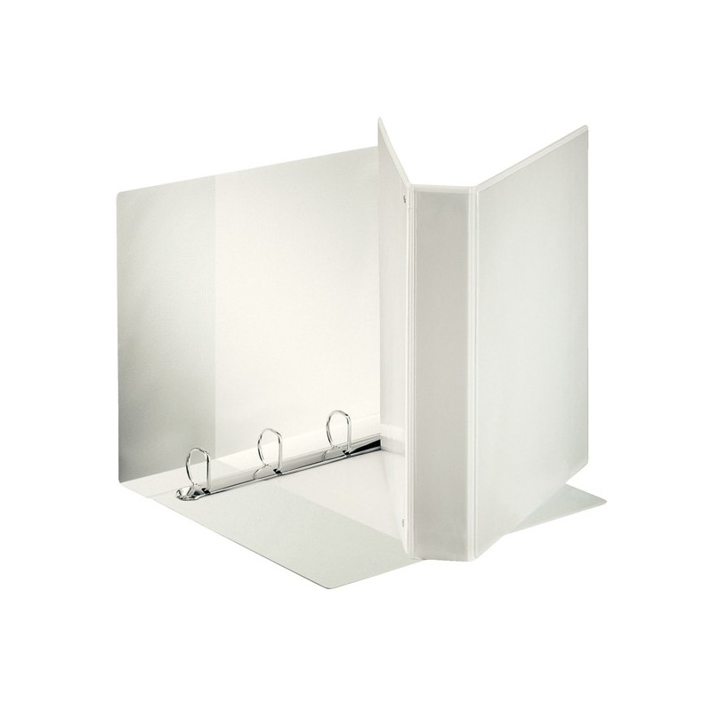 Raccoglitore display formato Maxi, in cartone da 2 mm rivestito in polipropilene eco-compatibile con finitura tipo pelle. Il rivestimento, incollato su entrambi i lati e saldato ai bordi, garantisce un prodotto di qualità eccellente. Il formato del raccoglitore consente di inserire indici e intercalari in formato Maxi per ospitare buste a perforazione universale. La personalizzazione è resa agevole da tre tasche esterne, mentre due tasche interne permettono di contenere fogli sparsi e appunti. Meccanismo a 4 anelli (a D, altezza 40 mm). Formato utile: 22x30 cm (A4). Dimensioni: 270x350x40 mm. Capacità: 380 fogli A4 (80 gr/mq). Colore bianco.