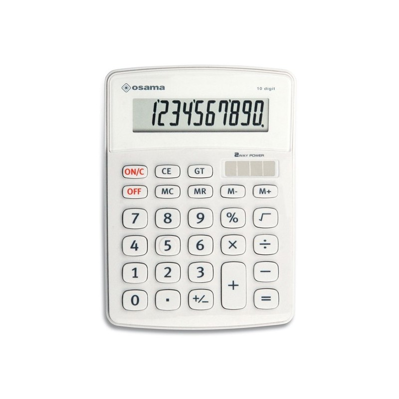 Calcolatrice da tavolo con grande display LCD inclinato a 10 cifre. Doppia alimentazione solare e a batteria (1xl1131). Tasti in plastica. Funzioni: calcolo percentuale, 4 tasti di memoria, radice quadrata, tasto gt, autospegnimento. Dimensioni 145x105x12mm. Peso: 150g.