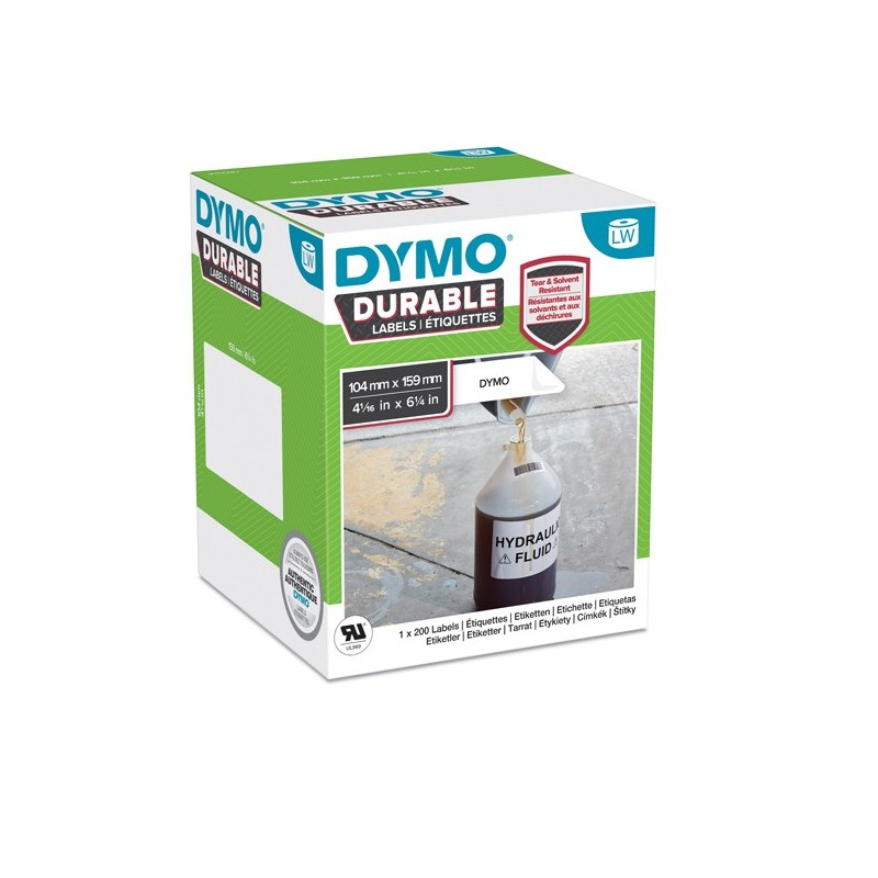 Rotolo di etichette permanenti LabelWriterTM DURABLE INDUSTRIAL in carta bianca multiuso 104x159mm(200et x rotolo). Utilizzabili solo con la stampante per etichette LABELWRITER 4XL: sono caratterizzate da un adesivo per uso industriale e sono resistenti allo scolorimento, al distacco e all'abrasione dovuti a luce del sole, caldo, umiditÓ e detergenti. Le etichette Permanenti DYMO DURABLE sono perfette per cucine, attrezzature sportive, armadi da esterno e altro.