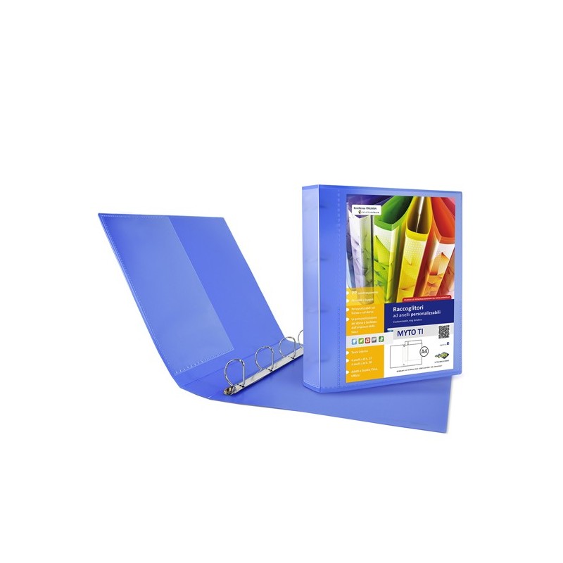 Raccoglitore personalizzabile in polipropilene colorato semitrasparente, con meccanismo a 4 anelli (a D). Dotato di tasche trasparenti sul 1° quadrante, sul dorso e all'interno. Inserimento facilitato della personalizzazione del dorso. Formato esterno: 275x320 mm. Formato contenuto: 220x300 mm (A4). Dorso: 40 mm. Diametro anelli: 30 mm. Colore blu.