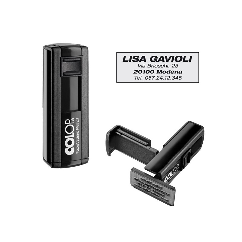 Timbro personalizzabile tascabile COLOP POCKET STAMP PLUS Un vero tascabile di qualità. Prestazioni ad alto livello e design elegante: un oggetto piacevole, oltre che utile. Nelle misure e nelle forme più diverse, per sottolineare la propria personalità in modo più deciso.TAMPONE DI RICAMBIO: E/PSP20