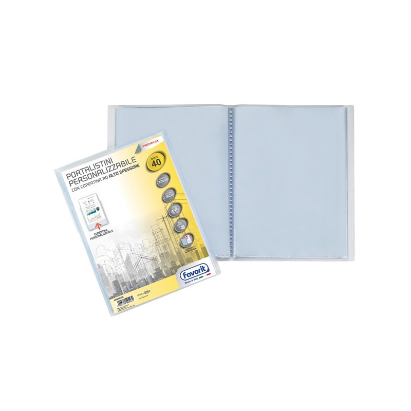Portalistini personalizzabili trasparente in polipropilene con 40 buste interne a finitura liscia ultratrasparente e copertina ad alto spessore con tasca per la personalizzazione. Formato utile: 22x30cm. Made in Italy.