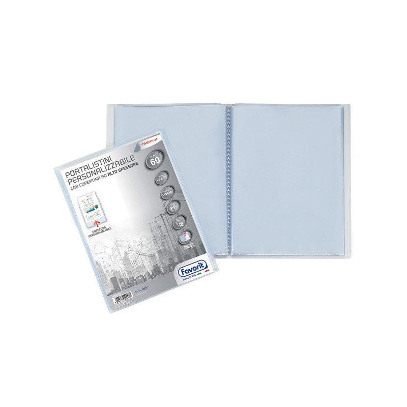 Portalistini personalizzabili trasparente in polipropilene con 60 buste interne a finitura liscia ultratrasparente e copertina ad alto spessore con tasca per la personalizzazione. Formato utile: 22x30cm. Made in Italy.