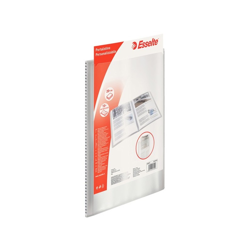 Portalistini formato A4 in polipropilene. A buste fisse con finitura a buccia antiriflesso. Tasca frontale per la personalizzazione. 10 buste.