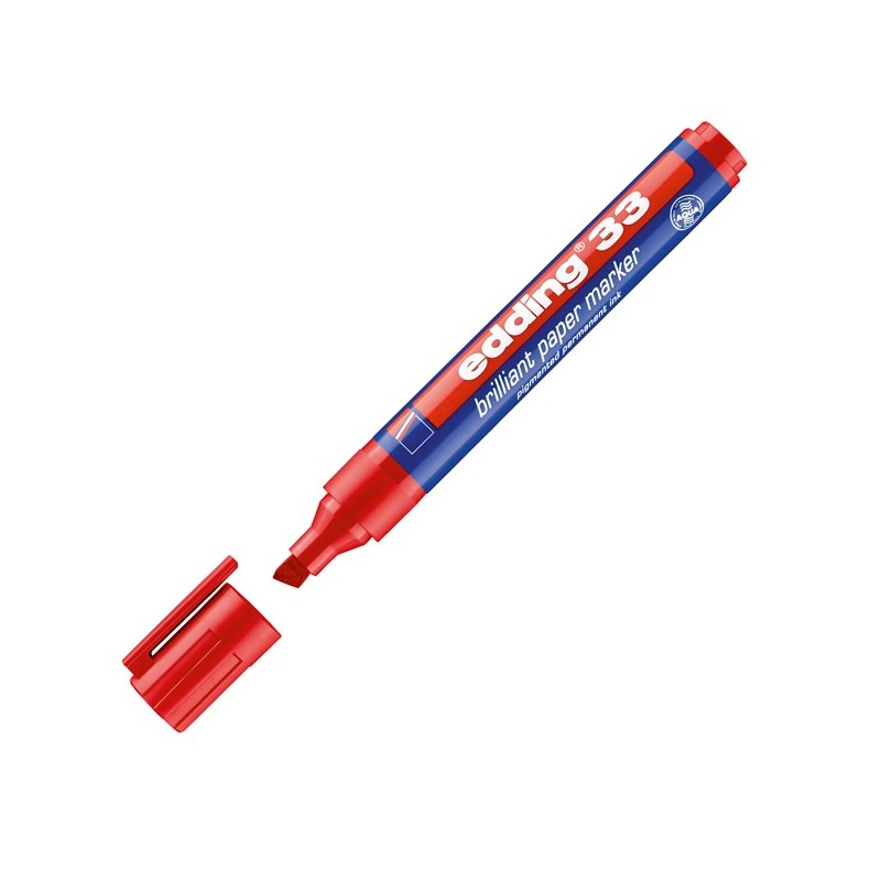 Marcatore indelebile brillante universale specialmente studiato per scrivere su carta e cartone, ma idoneo anche per scrivere su plastica, metallo e vetro. Inchiostro pigmentato a base d'acqua che non passa la carta. Punta scalpello 1,5-5,0mm. Colore: rosso.