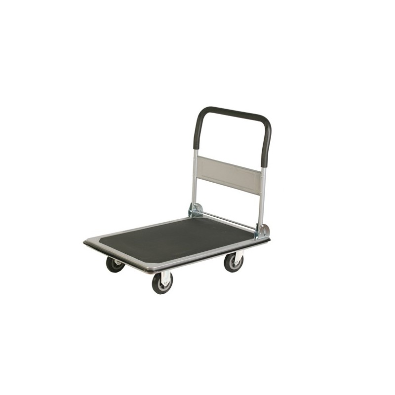 Carrello in lamiera rinforzata e maniglia tubolare ripiegabile tramite comando a piede. Piattaforma bordata in gomma e piano di carico rivestito con antiscivolo. Dotato di ruote in gomma piena. Dimensioni: L91 x P61 x H87cm. Portata massima 300kg.