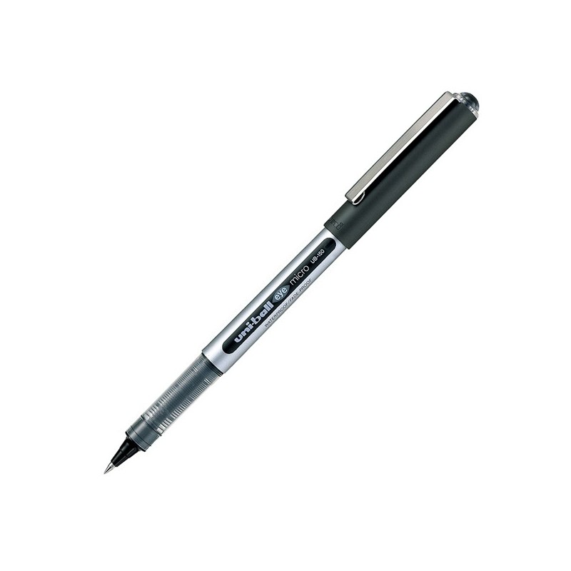 Roller uni-ball EYE ad inchiostro liquido. Resistente all'acqua e alla luce. Sistema "Uni-Flow" per flusso uniforme e costante. Scrittura scorrevole e precisa. Finestrella per il controllo del consumo di inchiostro. Punta 0,5mm. Colore: nero.