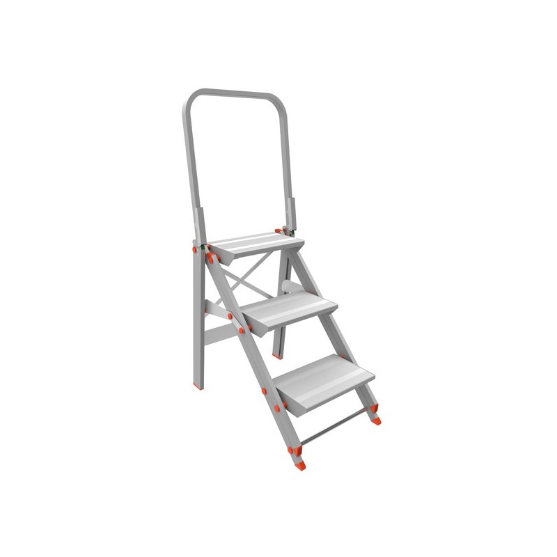 Scale robuste leggere e resistenti in alluminio anodizzato. Salita comoda grazie ai gradini piani con doppio profilo rinforzato, antisdruciolo 360x230mm. Dotate di parapetto da 60cm richiudibile ad innesto automatico. Altezza piattaforma 0,69m. UNI EN 131. D.Lgs 81/2008 art.113. D.Lgs 206/2005 art.2 consumatori. Portata massima 150 KG.