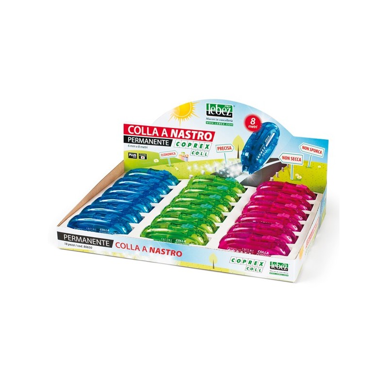 Espositore da banco con 18 colle a nastro Coprex 8 metri Lebez, con involucro traslucido in colori assortiti.