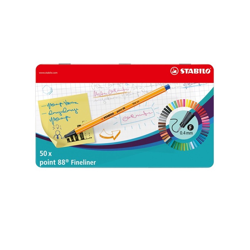 Scatola in metallo 50 colori. Punta in feltro con rinforzo in metallo per garantire una grande resistenza. Cappuccio ventilato antisoffocamento. Lunga durata anche senza cappuccio. Ideale per lavori con riga , fotocopie e stancils. Tratto da 0,4mm.