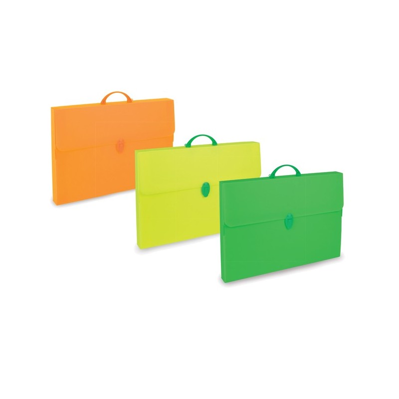 Valigetta in polipropilene alveolare con chiusura in colori assorititi: arancione, giallo e verde fluo.
