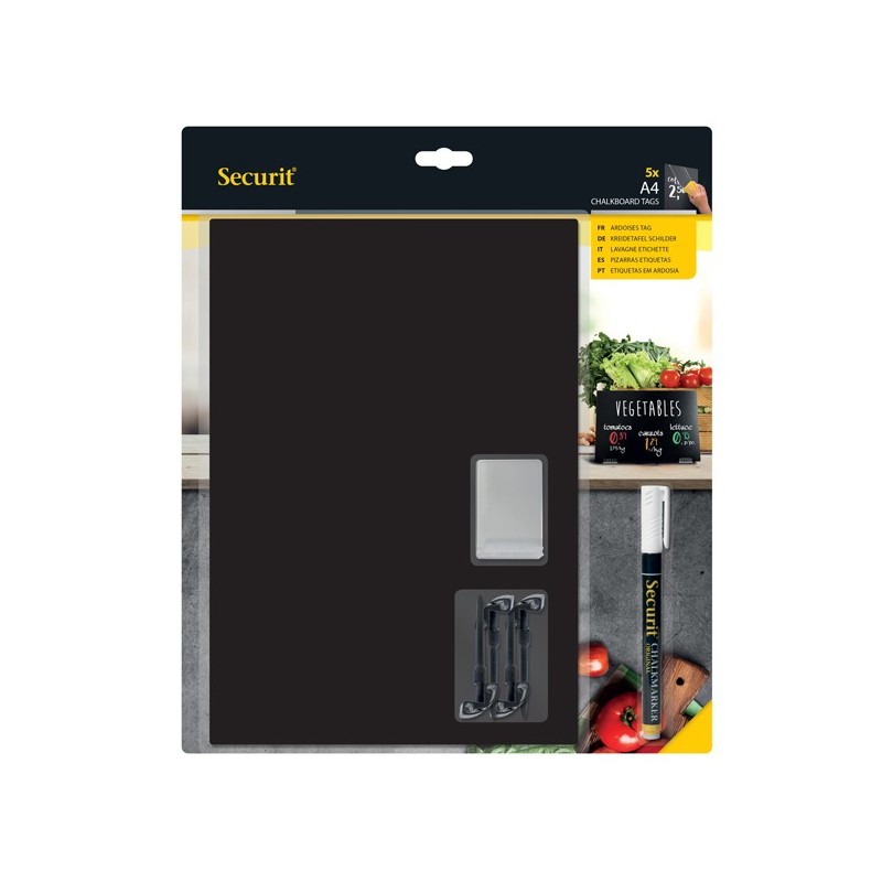 Set formato da 5 targhette nere scrivibili e cancellabili. Ideali come segnaprezzo o messaggi flash in bar, alimentari ecc. Fornito con 1 pennarello a gesso liquido bianco, 4 supporti a spina (cod. 77154) e 2 supporti trasparenti (cod. 77153).