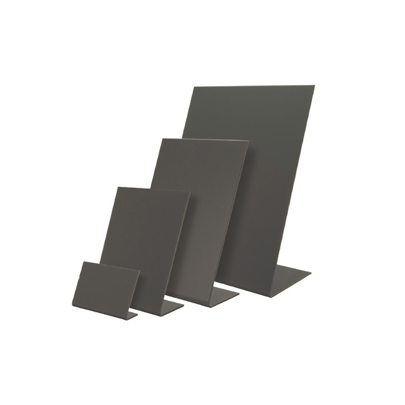 Lavagne in acrilico nero a forma di L. Resistenti e facili da pulire. Rifinitura della lavagna frontale satinata e retro lucido. Resistente ai raggi UV e agli agenti atmosferici.