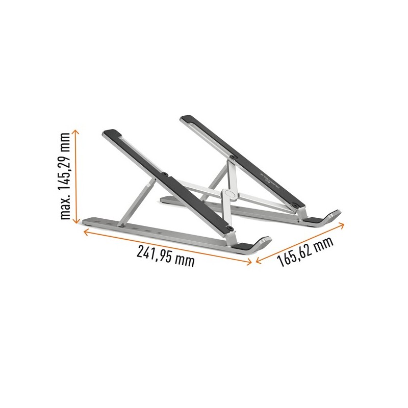 Supporto universale regolabile per pc portatili e tablet fino a 15"". Altezza regolabile in 6 step per un posizionamento ergonomico del dispositivo. Permette di utilizzare il pc portatile come schermo (in abbinamento a mouse e tastiera aggiuntivi). Elevata stabilità per lavorare in sicurezza. I gommini antiscivolo proteggono il dispositivo dai graffi. Pieghevole, salvaspazio e comodo da portare con sè. La confezione include anche una comoda pochette da viaggio per riporre il supporto quando non in uso. Ottima dissipazione del calore