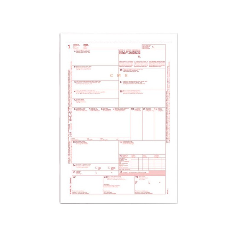 Lettera di vettura internazionale CMR, 5 copie snap autoricalcanti. Formato 31x21cm.