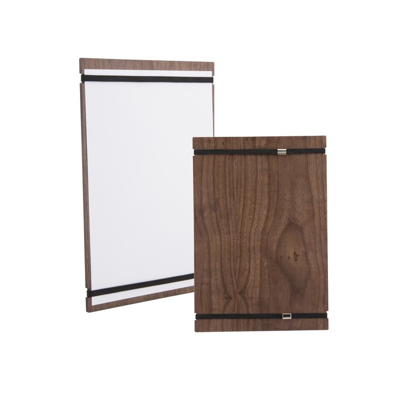Porta menù in legno con 2 bande elastiche che trattengono il menù. Dimensioni: 32x22x0,5cm.