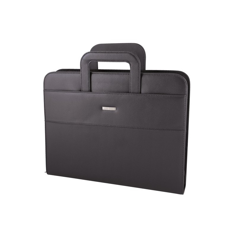 Portablocco in similpelle morbido colorato. Interno in tessuto a righe, chiusura con cerniera e dotato di manici rientranti. Varie tasche interne, 4 anelli metallici Ø3.5cm e completo di blocco.