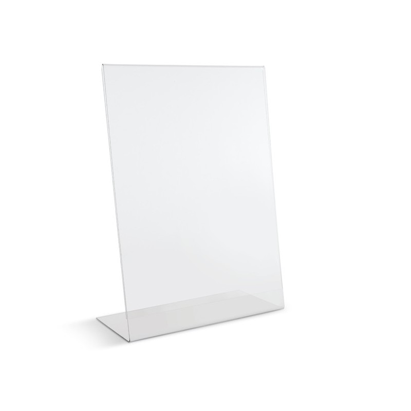 Display in PET trasparente (materiale riciclabile) idoneo al contatto con gli alimenti. Ottima resistenza agli urti e al fuoco. Ideale per ogni tipo di comunicazione e perfetto come porta menù o porta listino. Portadepliant con base a L utilizzabile sia in verticale che orizzontale. Formato A5 - 15x21cm - spessore 1,5mm.