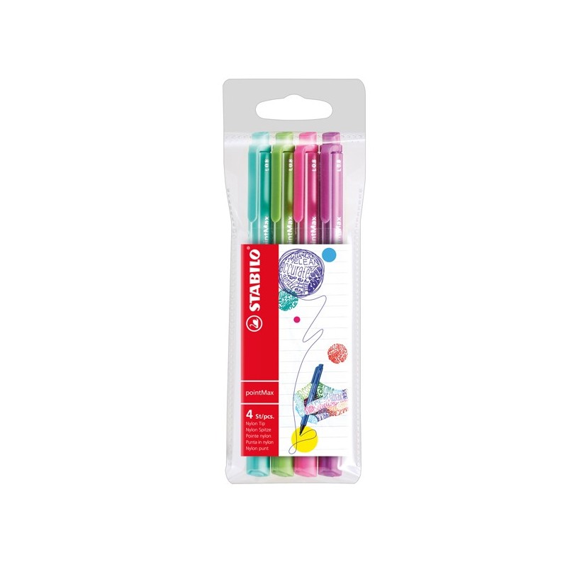 Astuccio 4 colori: azzurro,verde, rosa, viola. Fineliner con punta in nylon robusta. Inchiostro inodore a base d‘acqua. Tratto da 0,8 mm. Cappuccio ventilato. Resiste fino a 24 ore senza cappuccio. Dotato di comoda clip. Punta 0,8mm.