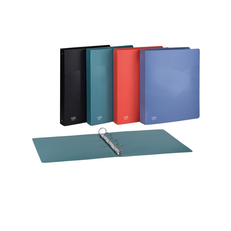 Realizzati in polipropilene opaco riciclato post consumo. Elegante trama geometrica brillante sulla superficie del prodotto. Certificazione Blue Angel a garanzia della salvaguardia dell’ambiente. Disponibili in 4 colori: azzurro, arancio, verde e nero. Formato interno: 22x30cm, con meccanismo a 4 anelli tondi diametro 15 mm o 30 mm.