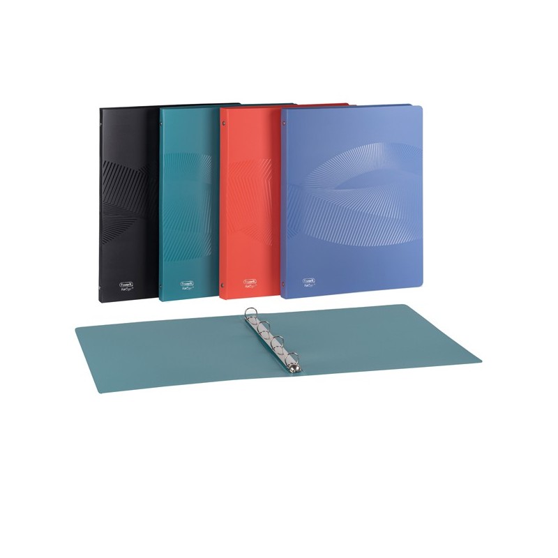 Realizzati in polipropilene opaco riciclato post consumo. Elegante trama geometrica brillante sulla superficie del prodotto. Certificazione Blue Angel a garanzia della salvaguardia dell’ambiente. Disponibili in 4 colori: azzurro, arancio, verde e nero. Formato interno: 22x30cm, con meccanismo a 4 anelli tondi diametro 15 mm o 30 mm.